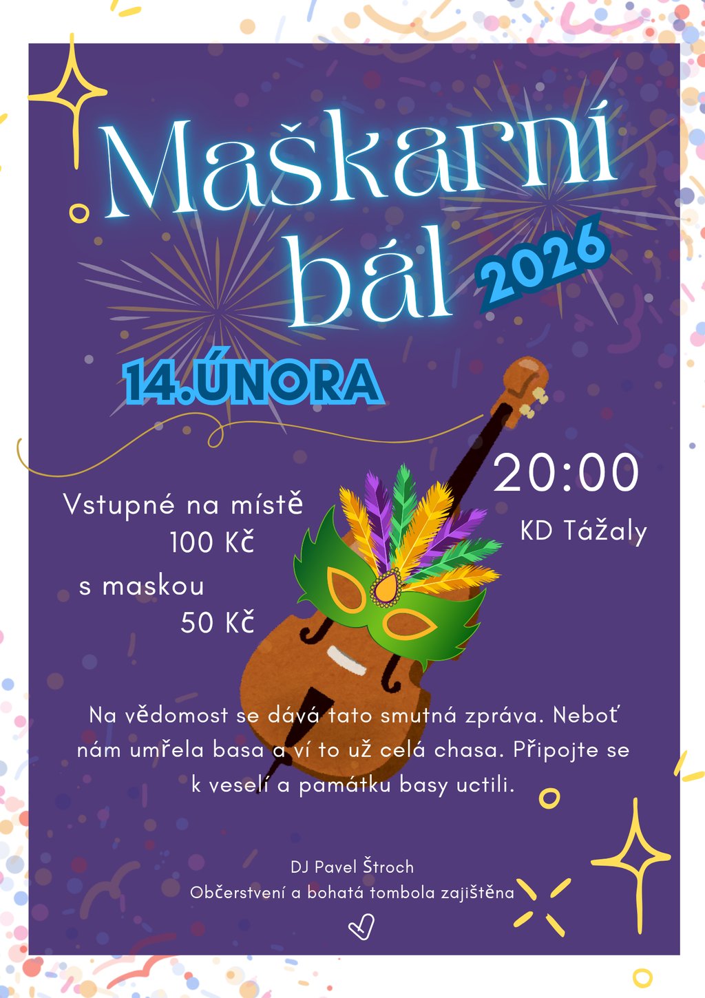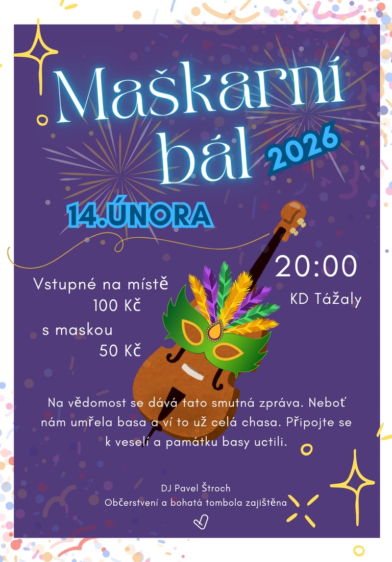 🔥 Kdy a kde? 14. února od 20:00 v KD Tážaly. O hudební jízdu se postará DJ Pavel Štroch, občerstvení bude připravené a k tomu bohatá tombola (protože štěstí přeje odvážným… a taky těm, co si koupí lístek 😄). Vstupné je 100 Kč, ale s maskou jen 50 Kč – takže jasná mise: masku na obličej a jedeš.